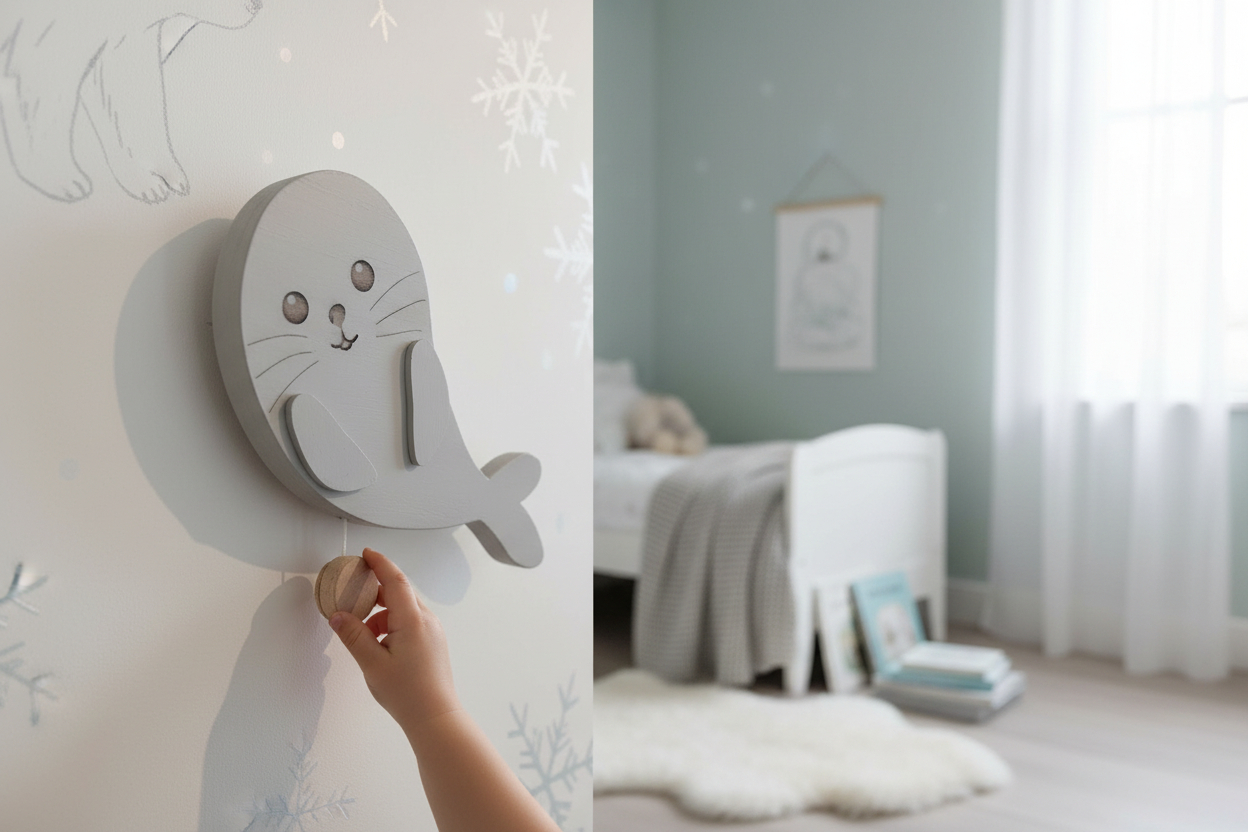 Boîte à musique murale phoque en bois faite main en Dordogne. Bois européen, peintures biosourcées et mélodie douce pour la chambre de bébé ou d’enfant.