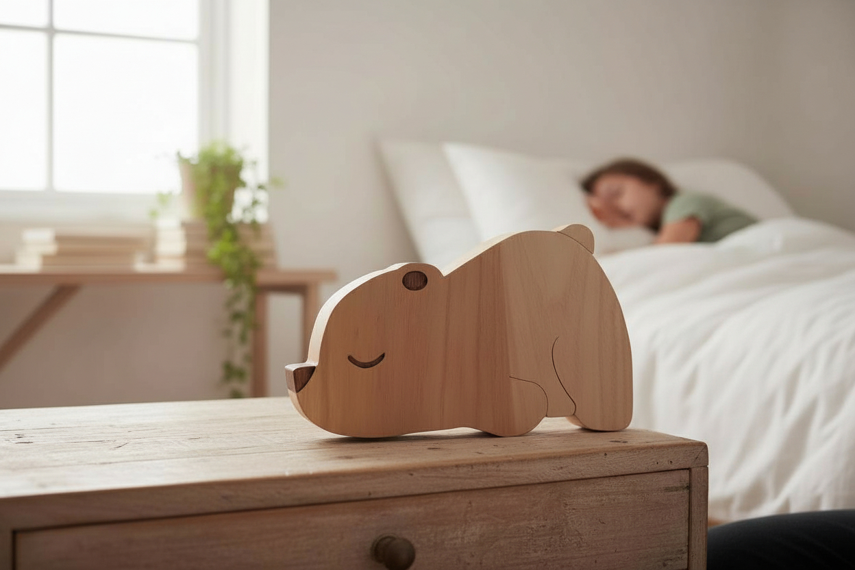 Chaque veilleuse est découpée, poncée, et assemblée à la main. Nous utilisons du bois européen soigneusement sélectionné, dans une démarche respectueuse de l’environnement et adaptée à l’univers de l’enfance. Chaque pièce est unique, mettant en valeur les nuances naturelles du bois.