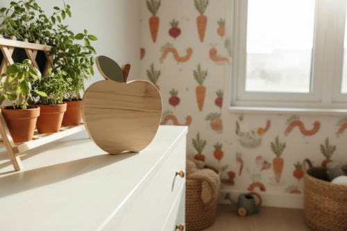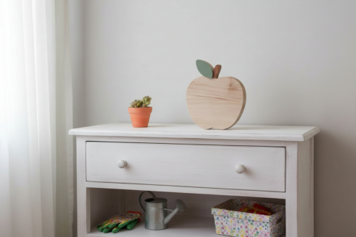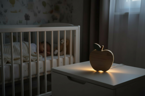 Veilleuse pomme en bois faite main en Dordogne. Bois européen, peintures biosourcées et lumière douce pour une chambre de bébé ou d’enfant.